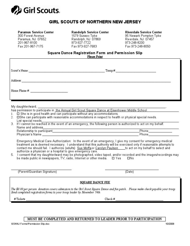 Girl Scouts Of Northern New Jersey Square Dance Registration Form And Permission Slip New Jersey Hospital