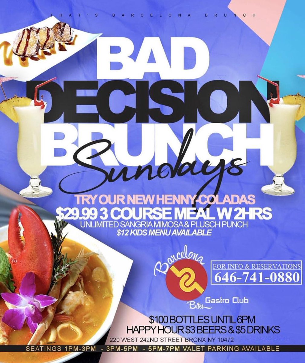 Whatsthemovenyc On Twitter Bad Decision Brunch Sundays 12pm 9pm Barcelona Bites 220 West 242nd St Bronx Nyc 30 Gets Your A 3 Course Brunch Meal And 2 Hours Unlimited