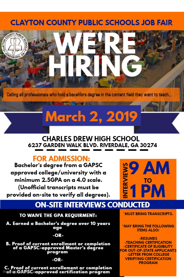 Clayton County Public Schools On Twitter Reminder Clayton County Public Schools Will Host Its 2019 Spring Teacher Job Fair On Saturday March 2 At The Charles Drew High School From 9 00 Am