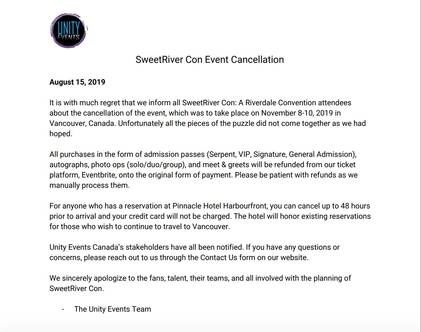 Unity Events Canada On Twitter Announcement Sweetriver Con 2019 Cancellation Please See Attached Photo For Notice We Sincerely Apologize For The Cancellation Of This Event Https T Co Yj0wf6whki
