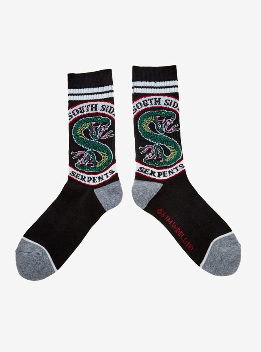 Men s us size 3 5 12 women s us size 5 14 uk size 4 11 5 eu size 36 46 knit with reinforced toe and heel with extra cushioning in the sole 75 polyester 22 nylon 3 elastane. It s the perfect addition to your riverdale collection. Free worldwide shipping. Riverdale south side serpents crew socks 1 pair of black casual printed tube socks for men women adult fashion novelty socks perfect for everyday wear other occasions fits shoe sizes 6 12 5 0 out of 5 stars 1 7 99 7 99 9 59 9 59.